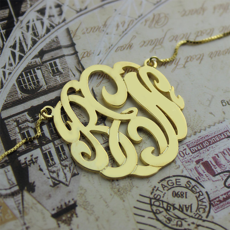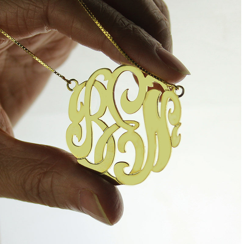 1. A monogram necklace is typically structured with the last name as the large initial in the center, first name initial on the left, and middle name initial on the right.