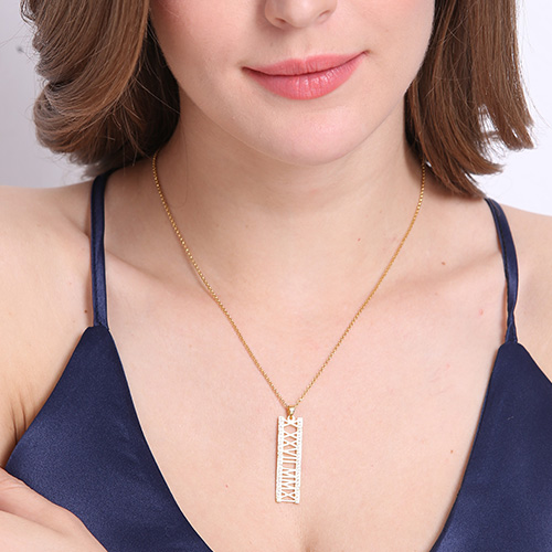 18K Gold Plated Roman Numeral Bar Necklace With Birthstone - In life, there are so many days to remember, honor and celebrate-- days when your smile could not help but radiate and days when you felt and understood the importance of family, love and friendship by having those people close by. Personalize this sterling silver vertical stick pendant with a date, in Roman numerals, important to you . Consider customizing it with your birthday, your wedding day, the birth of a child or the memory of an important person who made a difference in your life. Hang this meaningful symbol close to your heart.