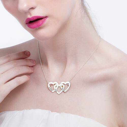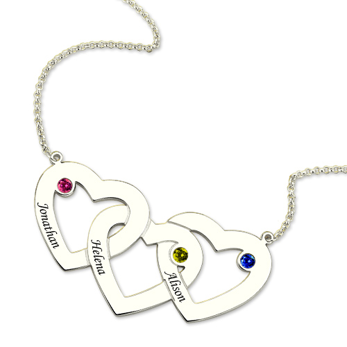 3 Intertwined Hearts Birthstones Name Necklace Sterling Silver