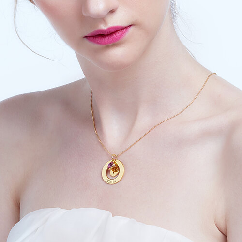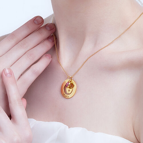 A heartfelt gift that is sure to be cherished, this personalized baby footprint pendant is a delightful remembrance.You choose a big colorful birthstone to match the name engraved on the circle.A perfect commemorative gift for any new mom!