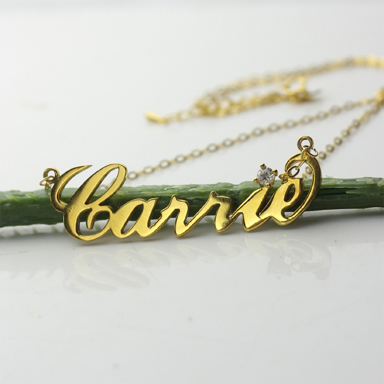 The Carrie name necklace in gold with a birthstone will prove to be worth buying. Select your birthstone and tell whether you want to prefer a beautiful necklace in sterling silver 925. We can make one or more names of your special people.