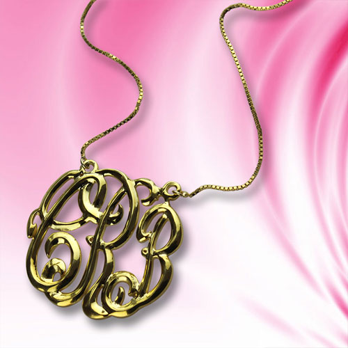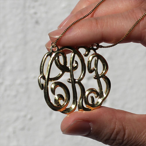 1. A monogram necklace is typically structured with the last name as the large initial in the center, first name initial on the left, and middle name initial on the right.