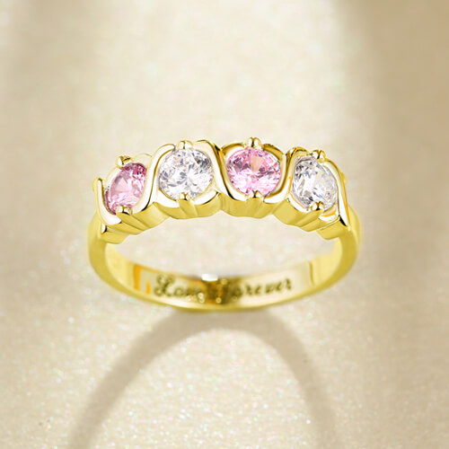 Designed to delight, this stunning ring shimmers with her very special birthstone in a timeless Fourfold-stone setting. The 4 stone hugs and kisses customizable birthstone ring celebrates the special people in anyone's life. These 925 sterling silver bands are crafted with four shining zirconias of your choice which sit in between the X's in the XOXO. Inside the ring band you can choice engraving any special words up to 20 characters make the ring more meaningful.These customized cz rings makes great gifts to represent children, grandchildren or loved ones when you create jewelry for mom or grandmother! You can also enjoy thinking of loved ones every time you wear your custom made family band. Give someone a hug and kiss that lasts a lifetime when you give them this unique and extraordinary personalized gift.