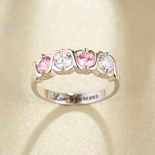Designed to delight, this stunning ring shimmers with her very special birthstone in a timeless Fourfold-stone setting. The 4 stone hugs and kisses customizable birthstone ring celebrates the special people in anyone's life. These 925 sterling silver bands are crafted with four shining zirconias of your choice which sit in between the X's in the XOXO. Inside the ring band you can choice engraving any special words up to 20 characters make the ring more meaningful.These customized cz rings makes great gifts to represent children, grandchildren or loved ones when you create jewelry for mom or grandmother! You can also enjoy thinking of loved ones every time you wear your custom made family band. Give someone a hug and kiss that lasts a lifetime when you give them this unique and extraordinary personalized gift.