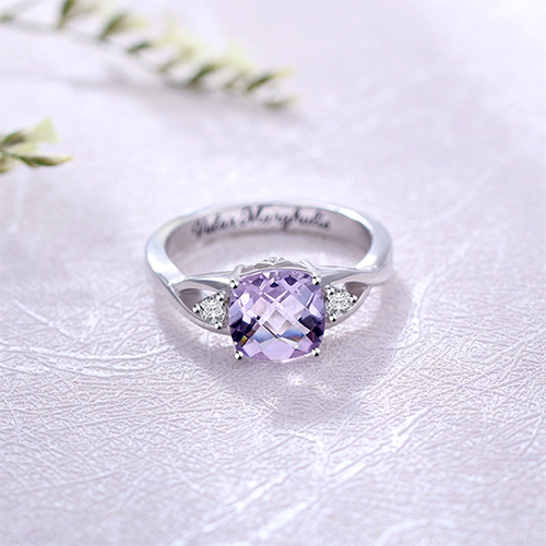 Featuring a lavish 8 mm millennium cut cubic zirconia stone, this shining ring is an eye-capturing masterpiece. The center stone is flanked on both sides by tiny CZs to accentuate its glimmer and elegance. Finely handcrafted of 925 sterling silver. This charming ring can be customized with any special words and short sentence up to 16 characters inside the ring band . You can also choose the birthstone color as your need, create a unusual gift for your loved one. Whether you are looking for an engagement ring or a special gift, this item is a great choice. It is available form ring sizes 6 through 10.