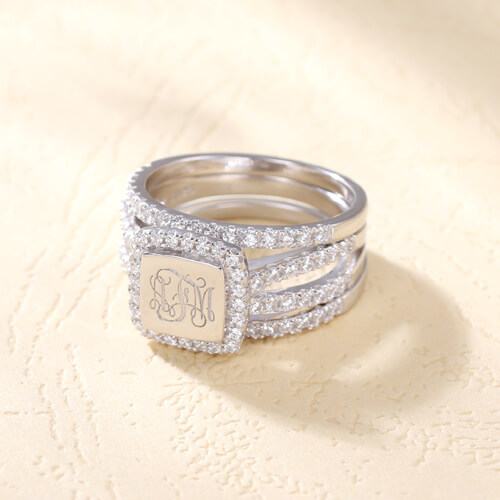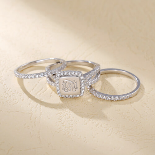 This cubic zirconia accented three-piece stackable class ring is exquisitely set in 100% 925 sterling silver with special square-shaped design, featuring shining cubic zirconia. Beautiful when worn as a single ring or stacked to form a vogue look. State your initials in the order in which you would like them, left to right. Attract attention wherever you go,reflecting your unique individuality. These precious rings are the perfect gift for a new bride too! Let's create your personalized rings.