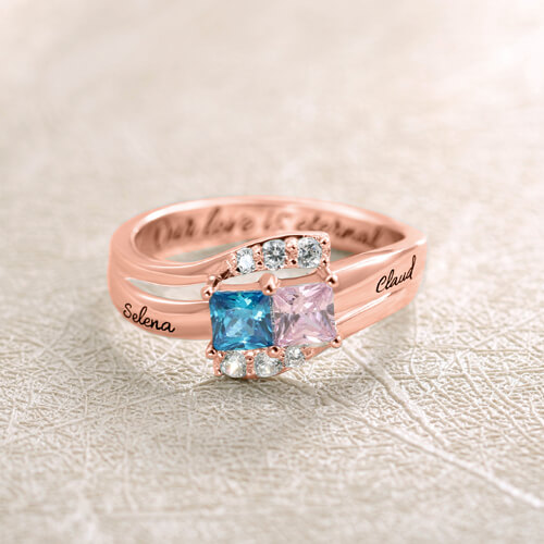 It takes two special people to create a bond that promises happiness forever and always. Now, wear a dazzling expression of how wonderful it is to have someone who makes you feel this way with the Love's Promise ring. Customized with 2 crystal birthstones and 2 engraved names, this 2 stone birthstone ring is a beautiful symbol of the forever love between you and your significant other. Carry the reminder of your bond with you always with double cubic zirconia square-shaped stones each to represent your different birth months.Engraved on either side of the crystals are your names or any special word up to 8 characters. Select the birthstone color of your choice and we'll place them in this beautiful setting. Made with solid 925 sterling silver, the customized zirconias make a beautiful gift that she will treasure forever. Engrave the inside of these bands with a special date, names, or a special message for a personalized touch. These customizable rings make an unforgettable birthday, Mother's Day, or just because gift. Womens sizes 6 to 12 available. Order now!