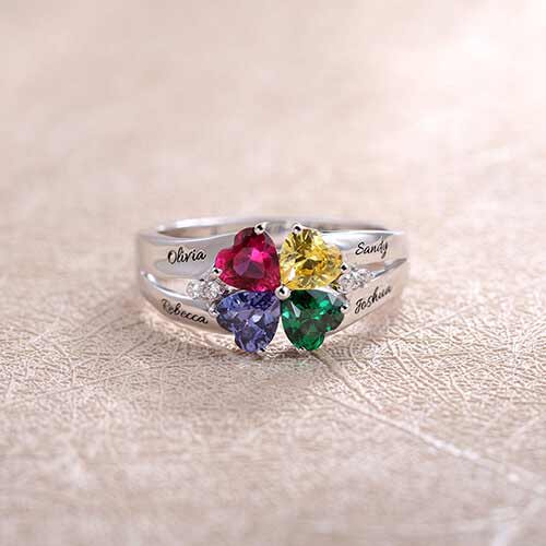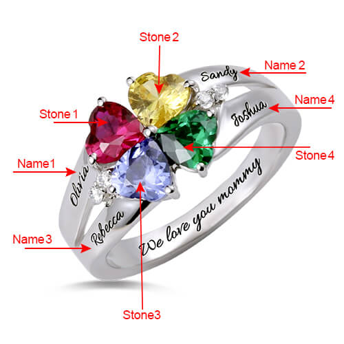 The birthstone material is Cubic Zirconia. Celebrate family with this Four Heart Birthstone Ring for mom. Creating the lovely style in 925 sterling silver, four birthstones color of your choice, and four heart shape cubic zirconium. Symbolizing you and your family members together forever. Glittering cubic zirconia presents a stunning accent along the curved shank. Personalized to fit your family, the shank can be engraved with four names, up to 10 characters and spaces each, elegantly written in the script. Inside the 4 Stone Birthstone Ring band, you can engrave up to 18 characters, any date, name, or special words as your need. Please see the alternate image for correct stone and name placement. Polished to a brilliant shine, it's a ring Mom will be delighted to wear. This is a lovely way to celebrate your family's bond or give Mom this distinctive mother jewelry gift to tell her just how much she means to you. Don't wait. Order now!