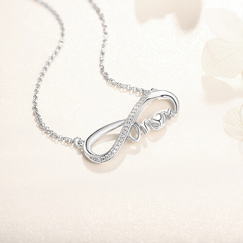 Because a mother's love is forever, our unique jewelry design create a personalized necklace for mom. This sterling silver Infinity Mother's Necklace, embraced by a symbol of infinity in gleaming silver. enhanced with dazzling zircon and a loving word "MOM"engraved on the reverse side, the letter "O" designed like a sweet heart.It is represent your loves for mother deeply. And you can choice the birthstone color to this silver pendant, to celebrate your mother's day gift for MOM! This 925 sterling silver birthstone Infinity mom pendant is handcrafted in the shape of the graceful infinity symbol with glittering diamond.Designed to touch any mother's heart. And it comes in a velvet pouch and gift box, perfect for gift-giving. This personalized birthstone pendant necklace is a mother's delight, Don't wait. order now for mom!
