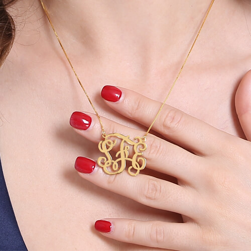 1. A monogram necklace is typically structured with the last name as the large initial in the center, first name initial on the left, and middle name initial on the right.