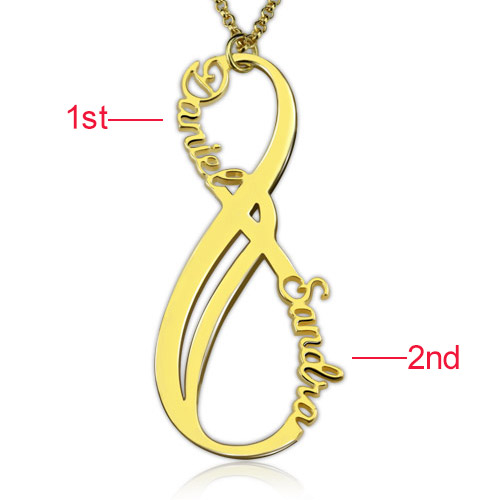 The infinity symbol can mean everlasting love and friendship and now you can personalize infinity with the Vertical Infinity Name Necklace. Customize this necklace with two names to show who your forever is.
