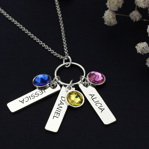Engraved Bar Necklace with Birthstones for Mothers Sterling Silver
