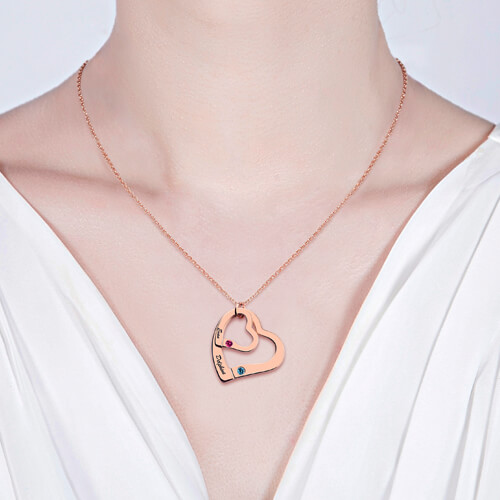 Add a minimalist touch of love to your look! Engraved Double Hearts Necklace featuring birthstone on the pendant.Two heart means lovers,families or relatives.Engraving custom name on the heart ,you wear it just like they have been on your side .