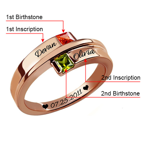 This double square birthstone ring is for the girl who is fashion on her mind.Customize the ring with two corresponding names you choose - each up to ten characters - engraved in a fancy script font. With this ring, you are special.