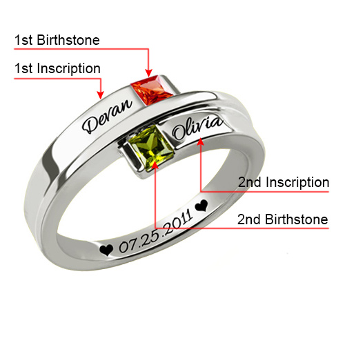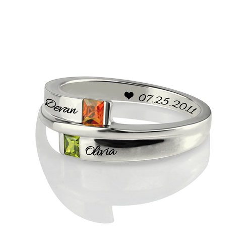 This double square birthstone ring is for the girl who is fashion on her mind.Customize the ring with two corresponding names you choose - each up to ten characters - engraved in a fancy script font. With this ring, you are special.