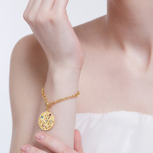 Engraved Family Tree Birthstone Bracelet 18K Gold Plated Silver