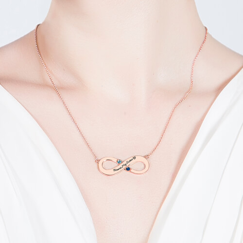 Showing off your infinite love for someone else just got easier and so much prettier with the Couple's Infinity Necklace with Birthstones. Drawing on the infinity jewelry trend, we have taken the infinity pendant necklace and made it even more special by adding the opportunity to engrave two names as well as choosing two birthstones.This beautiful engraved infinity necklace makes for a perfect gift for birthdays, anniversaries, or any other special occasion!