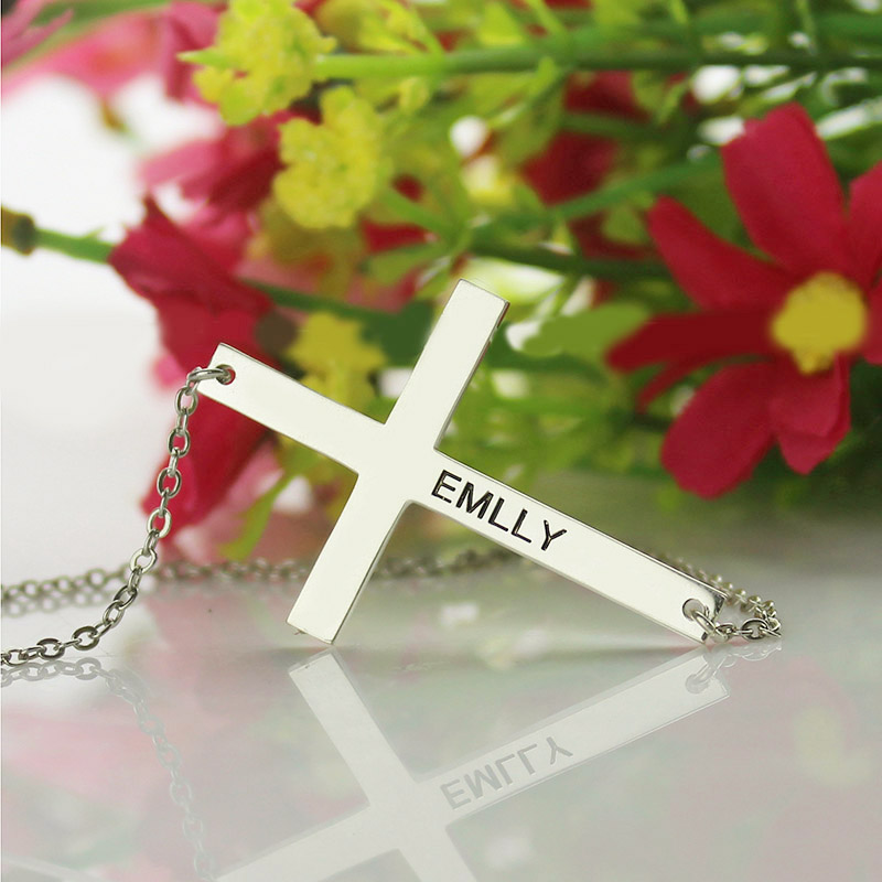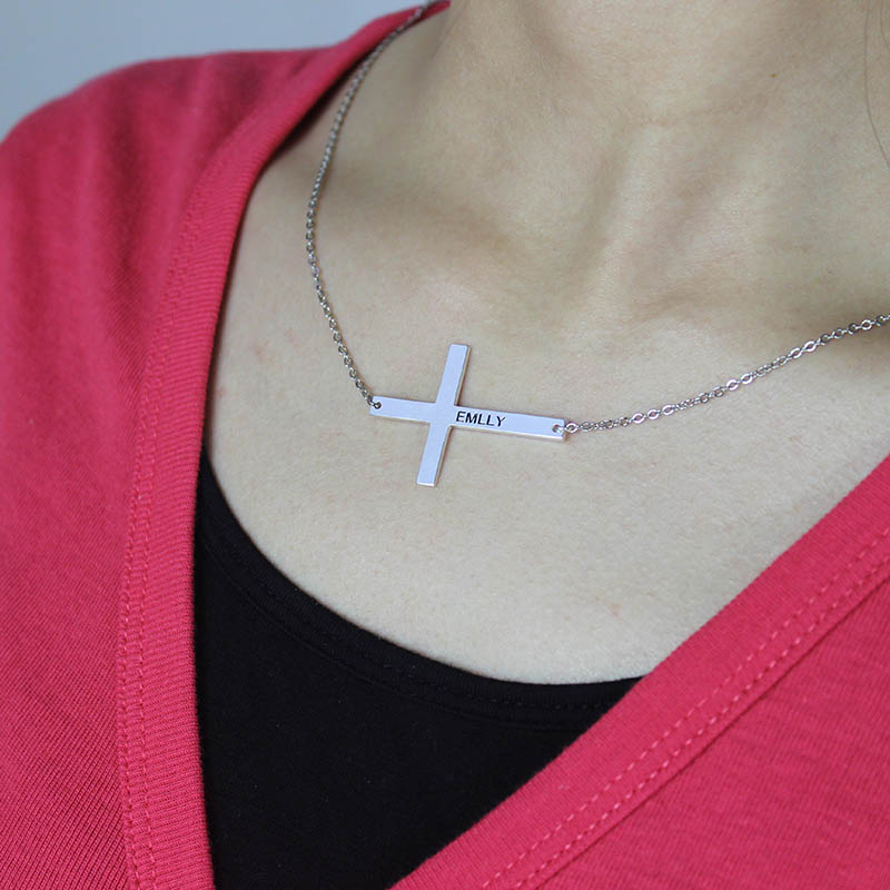 This Latin Sideways Cross Name Necklace 1.6" is more than just another cross-shaped piece of jewelry. Take a closer look and you will see an orthodox design modernized to suit contemporary fashion. This piece makes for a gorgeous and sleek jewelry item. Wear it with your name engraved on it, or gift it to the special one with his/her name adorning the necklace.