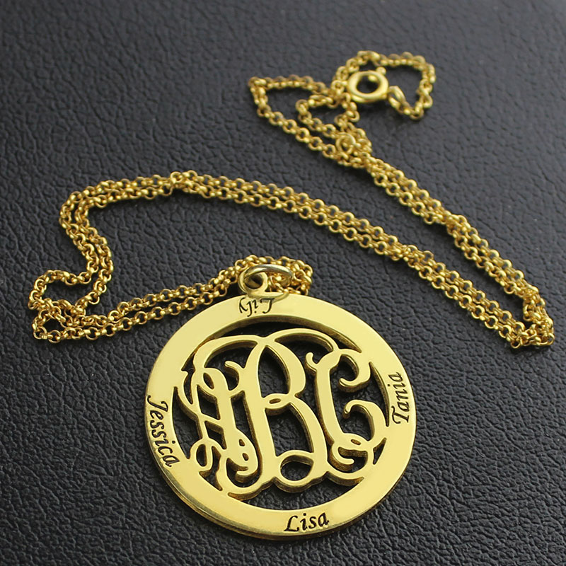 1. A monogram necklace is typically structured with the last name as the large initial in the center, first name initial on the left, and middle name initial on the right.