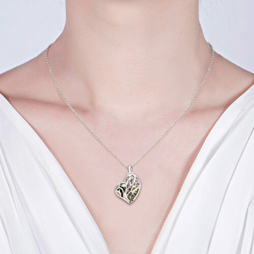 Keep the birthstones of your loved ones close to you in this Heart Cage Family Tree Birthstone Necklace features an open filigree design that can display up to nine heart 5MM birthstones of your choice. Heart Cage Family Tree Necklace come with 14-22 inch chain length for you choose .