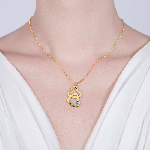 Show the one that you care about that you feel the connection too!Choose two names to be engraved on the hearts as well as two birthstones of your choice to be set within the hearts. Make it all about you and the love you share with this fantastic personalized script necklace!