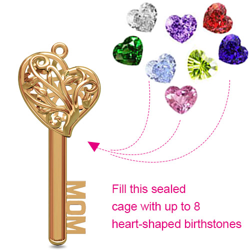 MOM Heart Cage Key Necklace allows 1-8 birthstone into the family tree design of cage, can represent a family get together and families deep love.It is an excellent gift for mother. The key shape can symbolize open someone's heart and can also be used to give person you like.