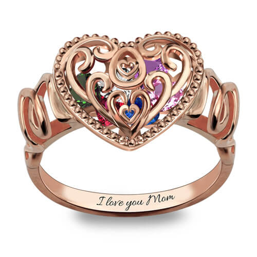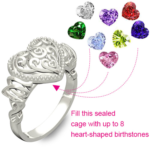 One of a kind gift for mother or wife to show your appreciation, love, and support towards them. MOM letters designed a heart cage ring, The large cage size allows space for up to 1-8 heart birthstones to make the ring even more special! Engraved names or other meaningful words inside of the ring to make it truly unique! It is not only a beautiful design but also a good moral. Engrave custom name or words inside of the ring.