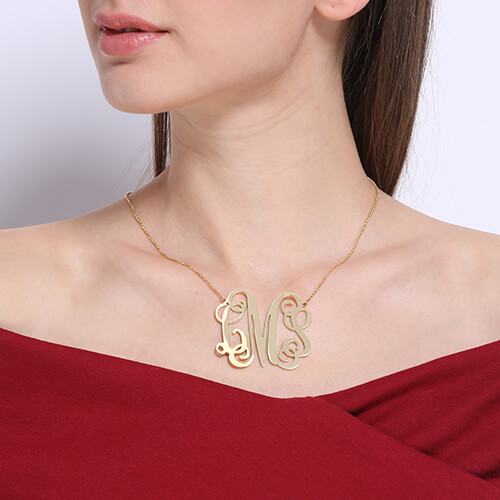1. A monogram necklace is typically structured with the last name as the large initial in the center, first name initial on the left, and middle name initial on the right.