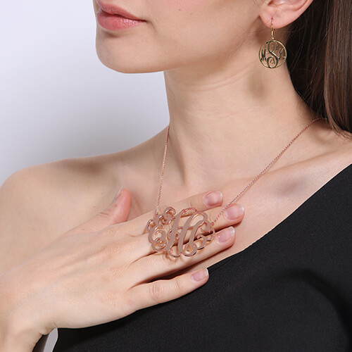1. A monogram necklace is typically structured with the last name as the large initial in the center, first name initial on the left, and middle name initial on the right.
