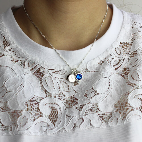 Personalized Double Initial Charm Necklace with Birthstone - Personalized Sterling Silver Birthstone Initial Charm. A mother's love for her children is endless. Symbolic of this perpetual care and support, surprise mom or grandma with a personalized Disc family pendant. Forming an instant heirloom, up to 3 family members may be represented with simulated birthstones and an inscription of their names, Spelling out your or a loved one's initial—is subtle but makes great impact, perfect for becoming a signature piece.