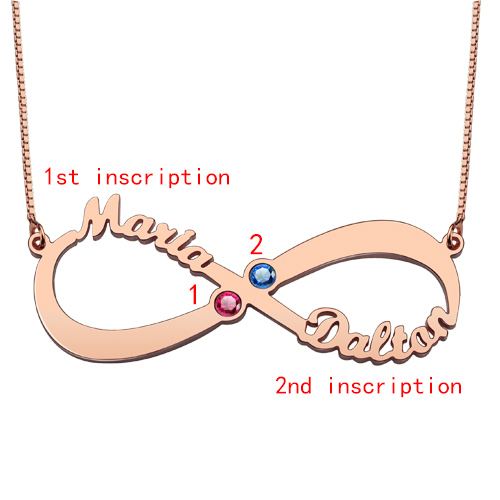 Be the envy of everyone you meet as you declare your forever love for all to see with the incomparable Infinity Name Necklace with Birthstones.Honor your infinite love with this stylish couple's necklace.This sterling silver necklace hangs from a box chain and can be set with two names of your choice to be set on either side of the infinity symbol.