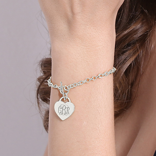 Personalized Monogram Toggle Heart Charm Bracelet For Her in Sterling Silver, With its modern good looks, this is a classic silver engraved bracelets that will look perfect with everything from jeans to dresses. A great gift for that special woman in your life–or even for bridesmaids as a way of thanking them for being there.Tell her she has got your heart with this engravable heart charm that can hold your initials on it .