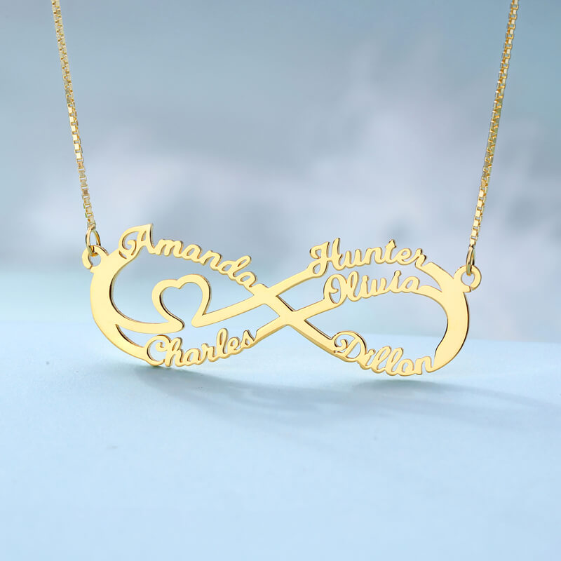 This Gold Infinity Necklace With 5 Names is the perfect accoutrement to any outfit, day or night, business or casual. Symbol of a eternal promise, with no boundaries. So, if you are looking for a personal and stylish piece of jewelry or a special gift, this necklace could be the ideal item to buy. This infinity jewelry support adding 5 names  on it, it can be initials to mean the eternal love, or best friend's initial with forever friendship meaning.