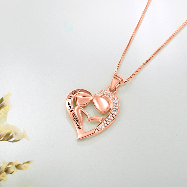 This mother and daughter necklace set is the perfect family necklace set to share with a mom and her children. This sterling silver mother daughter necklace features two different parts. The left part is a shape of child and also engraved a loving message of "A mother's love is forever" on left heart that will take mom’s breath away. The right part is the shape of mother and also full stones on the right heart that express infinite love to mom. Mother and daughter necklaces is becoming popular, and this sterling silver version will become a favorite of yours overnight..The words remind her you're thinking of her always and honor everything she means to you tat it's a special gift she will keep forever.