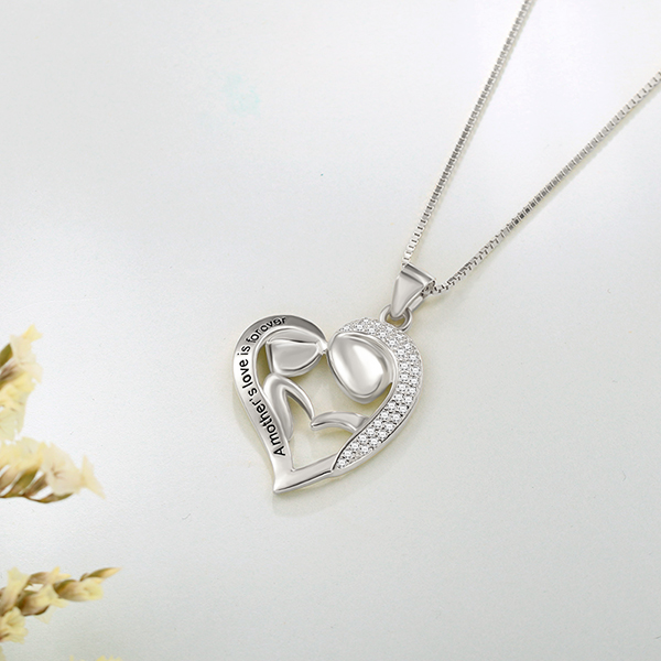 This mother and daughter pendant set is the perfect family necklace set to share with a mom and her children. This sterling silver mother daughter necklace features two different parts. The left part is a shape of child and also engraved a loving message of "A mother's love is forever" on left heart that will take mom’s breath away. The right part is the shape of mother and also full stones on the right heart that express infinite love to mom. Mother and daughter necklaces is becoming popular, and this sterling silver version will become a favorite of yours overnight..The words remind her you're thinking of her always and honor everything she means to you tat it's a special gift she will keep forever.
