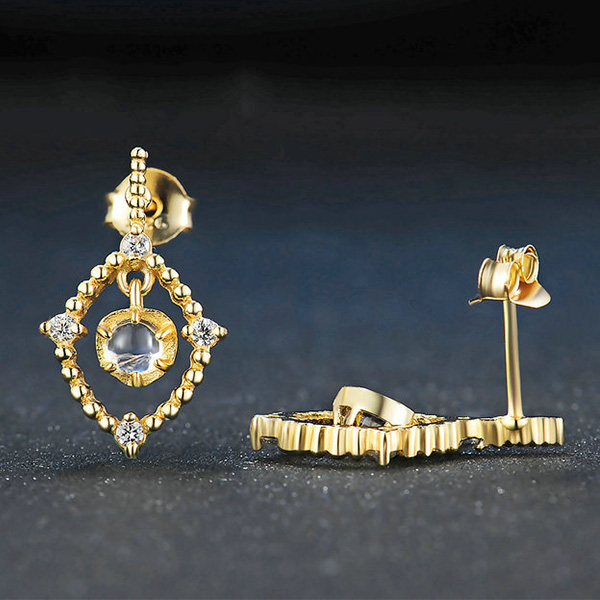 The contemporary design featuring a natural blue moonstone, which is surrounded by a total of 4 genuine cubic zirconite. These natural moonstone earrings were handcrafted in 925 sterling silver.This natural moonstone jewelry design is set with two gemstones of natural blue moonstone. The blue moonstone is good for people’s mind, and its beautiful appearance can make you or someone you loved more gorgeous and elegant. It’s a really suitable gift for birthday, anniversary and any other meaningful days.