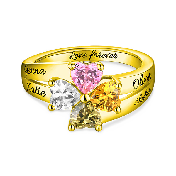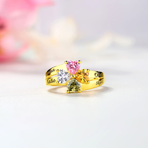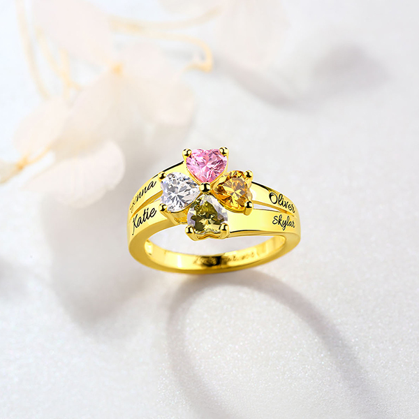 Share your love of family with this beautiful four stones mother ring. An exquisite statement ring that she’ll love to wear, this one features four sparkling birthstones, along with corresponding names. It is the perfect gift to give a mother or a grandmother to let her know how important she is and how much she is loved. A mom is the person who holds the family together, show it off with a beautiful ring with birthstones!