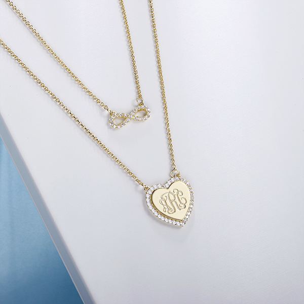 The Double Layered Necklace is the perfect dainty necklace set for everyday wear! It gives off that effortless, chic look everyone is trying to achieve! This double-layered necklace makes a stylish statement. Fashioned in sterling silver, this design features the monogram pendant and infinity pendant full of Cubic Zirconia crystals. Two different pendants suspended in each chain. You can also personalized this jewelry with any initials! This fashion necklace perfect for a birthday, anniversary, wedding, or just to celebrate someone (or something) very special.