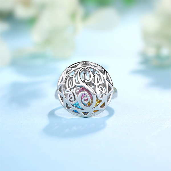Monogram Cage Ring With Heart Birthstones In Silver