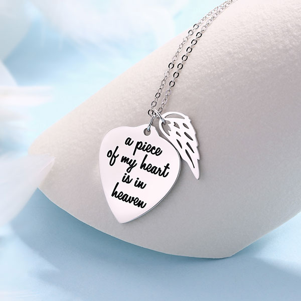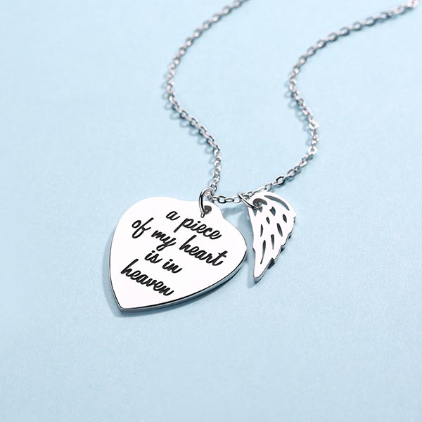 This personalized memorial heart necklace with wing charm design with stylish simple unique style made with Sterling Silver, Wings express they will always guard each other, you can carve words you want. It's a great gift for family and friends to cherish loved ones and elegant memorial necklace for everyday wear.
