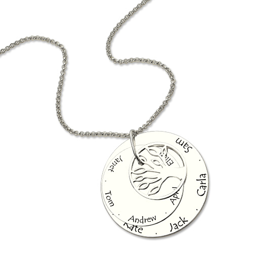 This personalised family tree with two disc necklace represents family and a mother's love. Names or dates of all the family will be carefully engraved onto each Disc.This tree of life necklace is also a great gift for grandmothers looking to keep their grandchildren close to their heart.