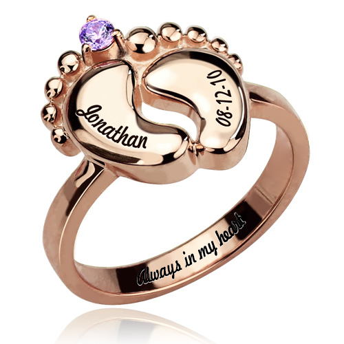 Engraved Baby Feet Ring with Birthstone Platinum Plated
