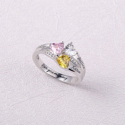 Thank mom or grandma for always being wonderful with this a one-of-a-kind loving gift, the Heart Personalized Ring. Exquisitely handcrafted in gleaming sterling silver, the flowing ring design is an artful creation with three personalized  heart birthstones finished by adding a sweet message to both sides of the shank and inside the ring band. A meaningful and heartwarming way to keep each child close and a celebration of love.